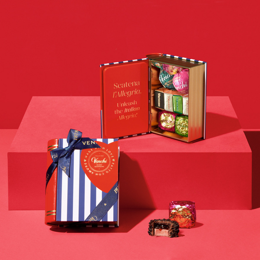 イタリアの老舗チョコブランド「ヴェンキ」のミニブック缶チョコは、青と白のストライプに真っ赤なハートがおしゃれかわいいデザイン缶。イタリア伝統のチョコレートが箱にギュッと詰まって、もらった時も開ける時もかわいいギフトです。