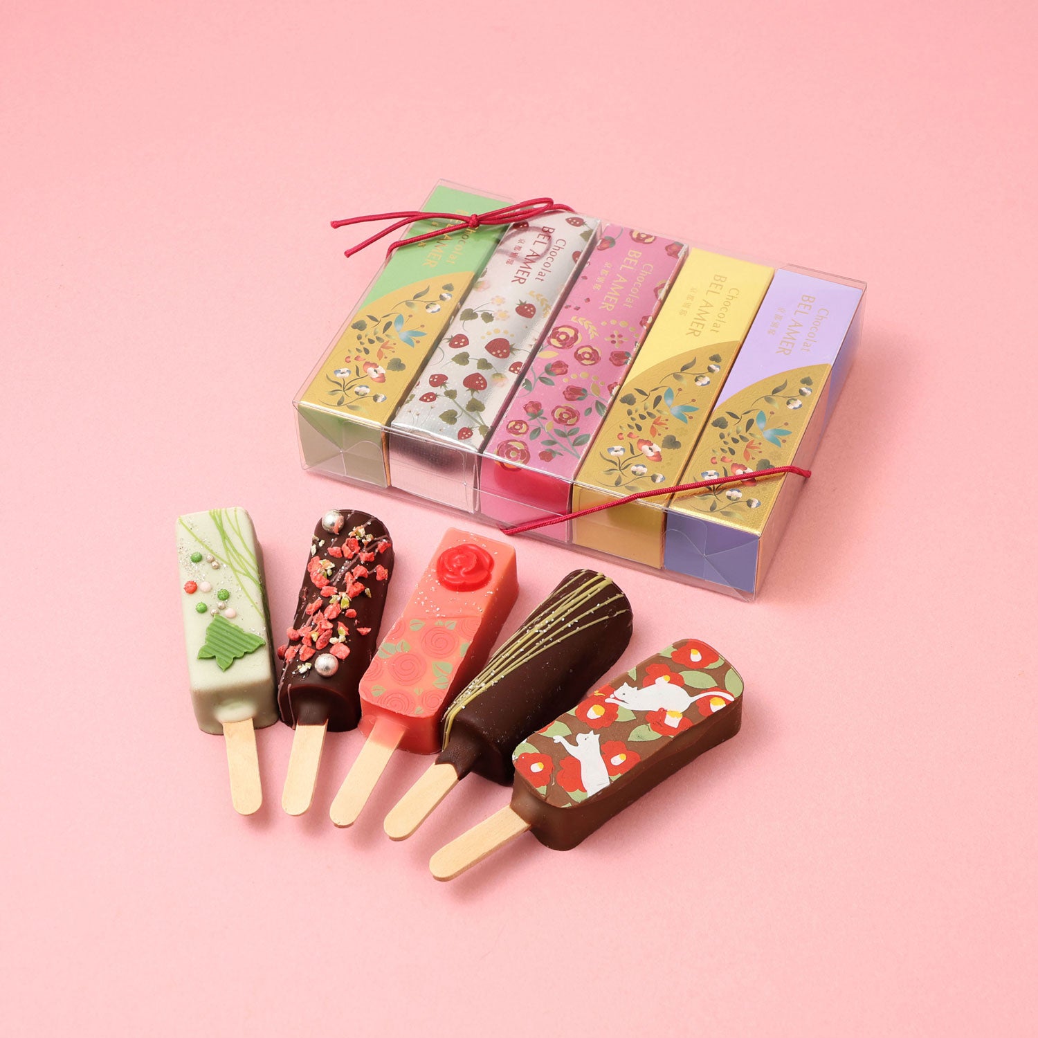 ショコラ ベル アメール 京都別邸のスティックショコラは、アイスバーのようなカジュアルさを持ちながら、京都らしいはんなりかわいいを実現してくれるチョコ。種類が豊富なので、色々組み合わせて贈れます。