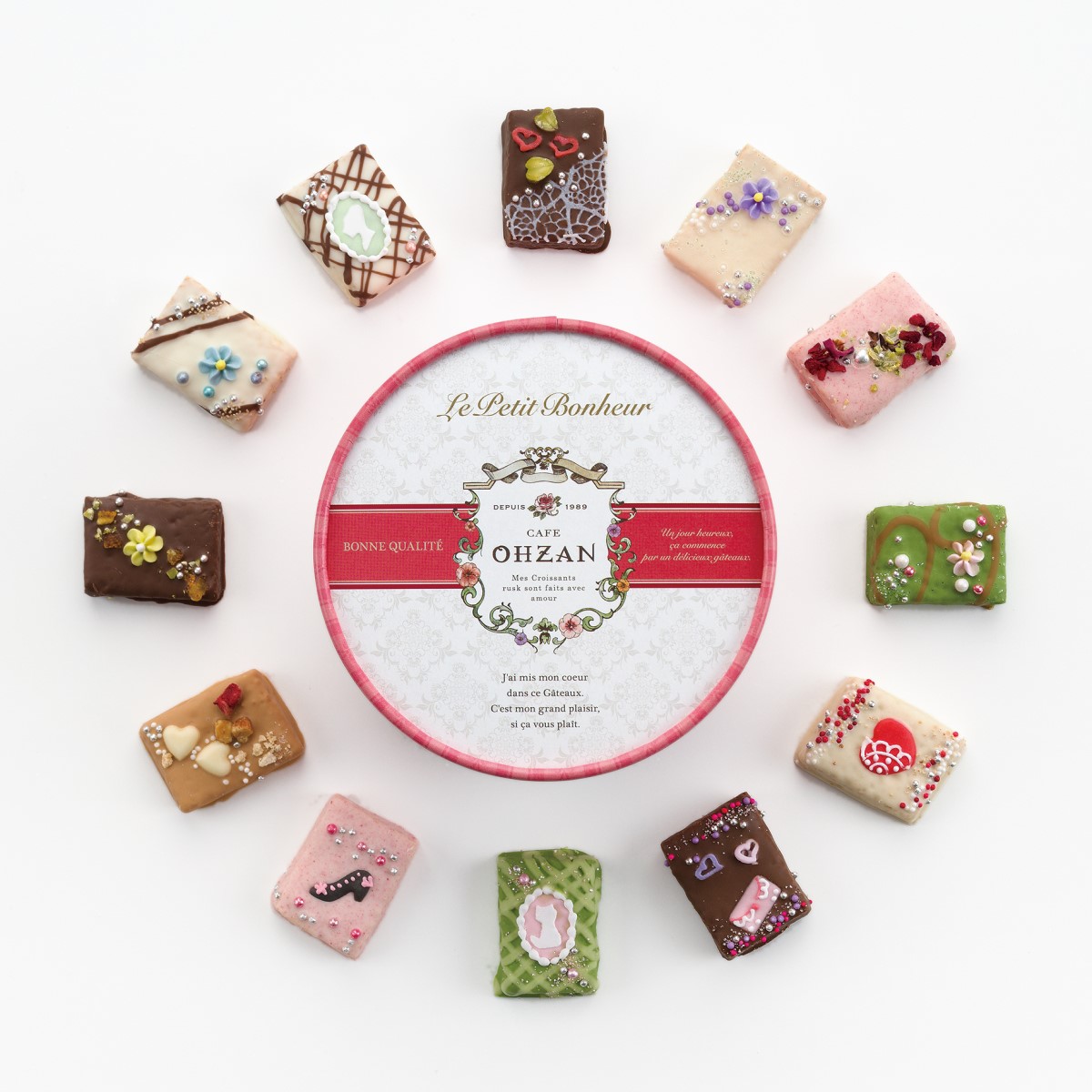 スイーツは可愛く、を信条にするカフェオウザン。中でもひと際可愛い、チョココーティングされたキューブラスクが人気です。お花やフルーツで繊細にデコレーションされ、一つ一つが可愛いアクセサリーのようなチョコスイーツ。個包装の12個入りで友チョコのプレゼントにもピッタリです。