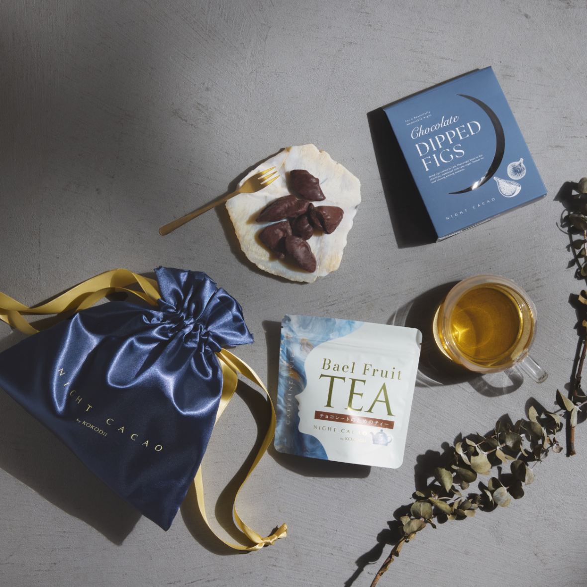 タイ産カカオのチョコレートブランド・Night Cacaoのギフトセット。チョコレートのために作られたノンカフェインのフルーツティーといちじくチョコが、ゴールドリボンの青いサテン巾着に入っています。華やかなパッケージは、男性から本命女性への逆バレンタインギフトとしても喜ばれそう!
